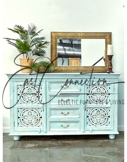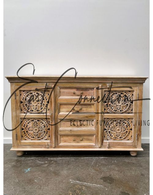 Sandblasted White Shabby Chic Mandala Carved Timber Sideboard Cabinet